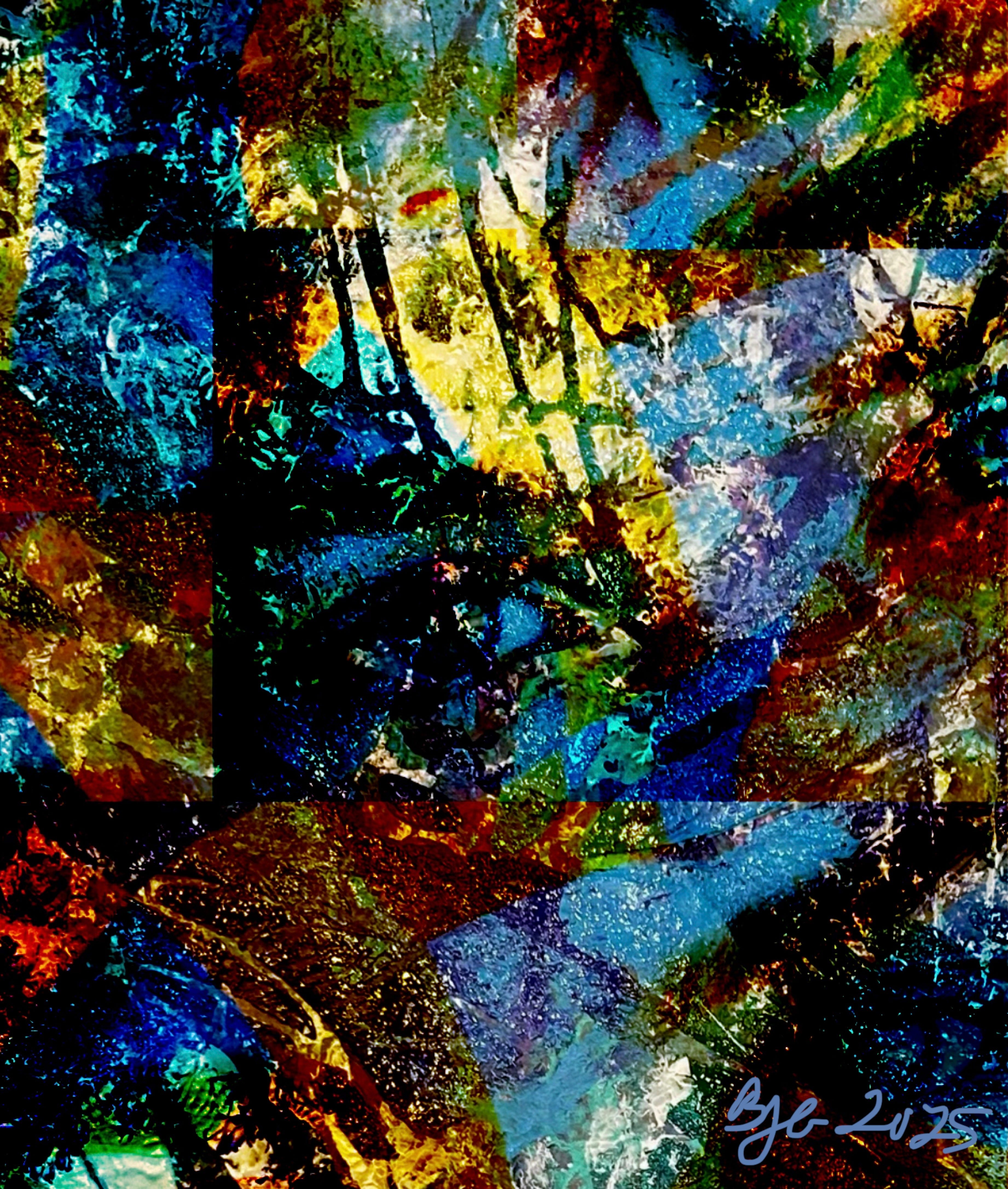 The use of bold blues, yellows, greens, and reds creates an eye-catching visual impact. The interplay between bright and dark shades enhances depth and movement.