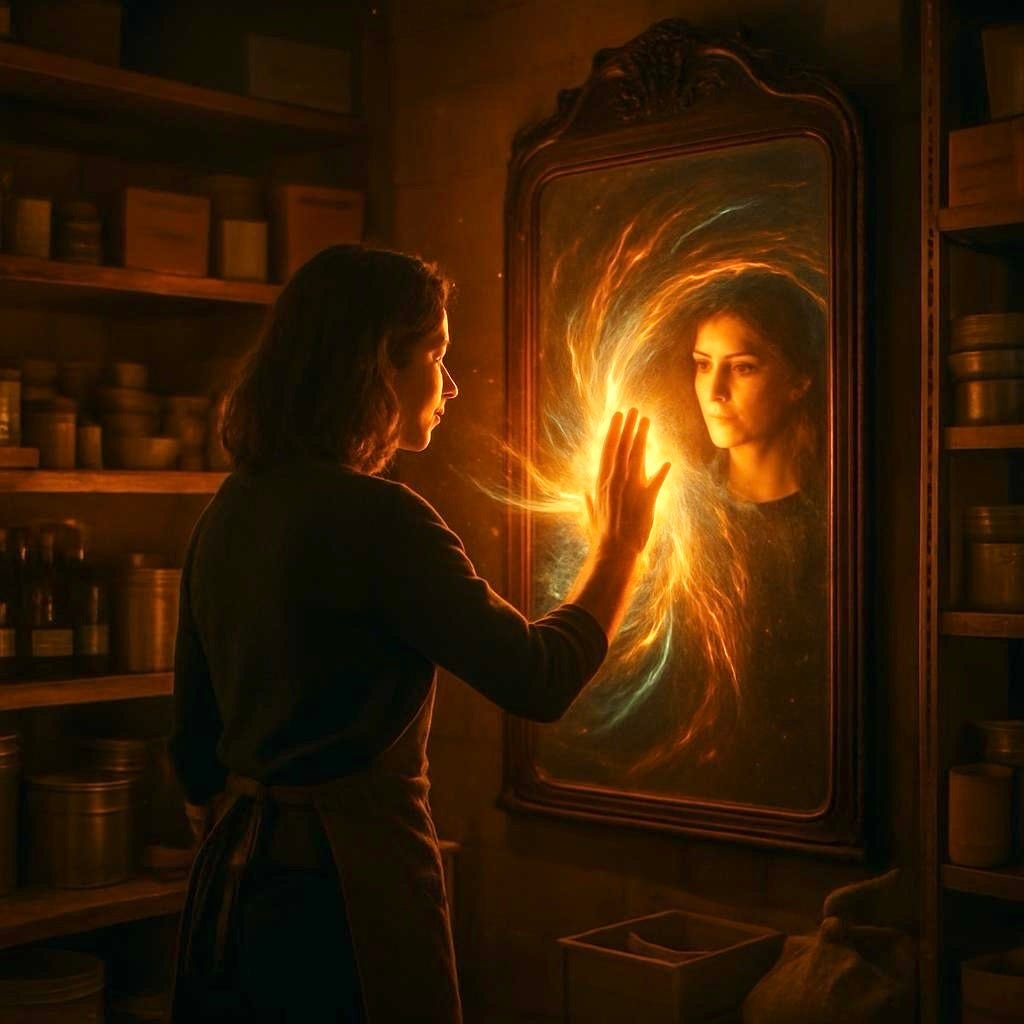 As I looked deeper into the mirror, I saw myself not as I was, but as I could be. Confident. Fearless. Alive in ways I'd forgotten were possible. The reflection reached out her hand, pressing it against the glass from her side. I raised mine, matching her gesture, and when our palms met, I felt a surge of energy course through me.